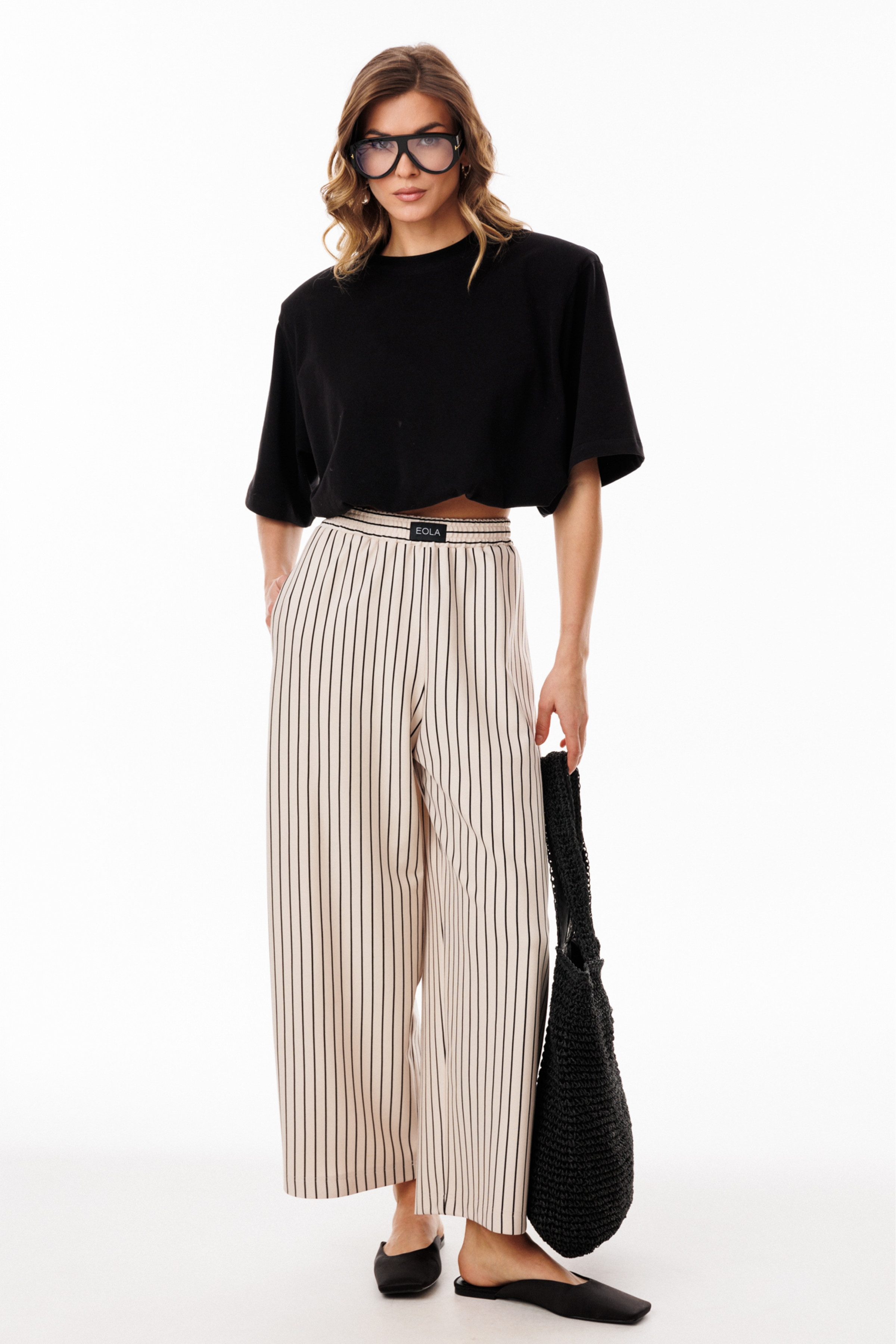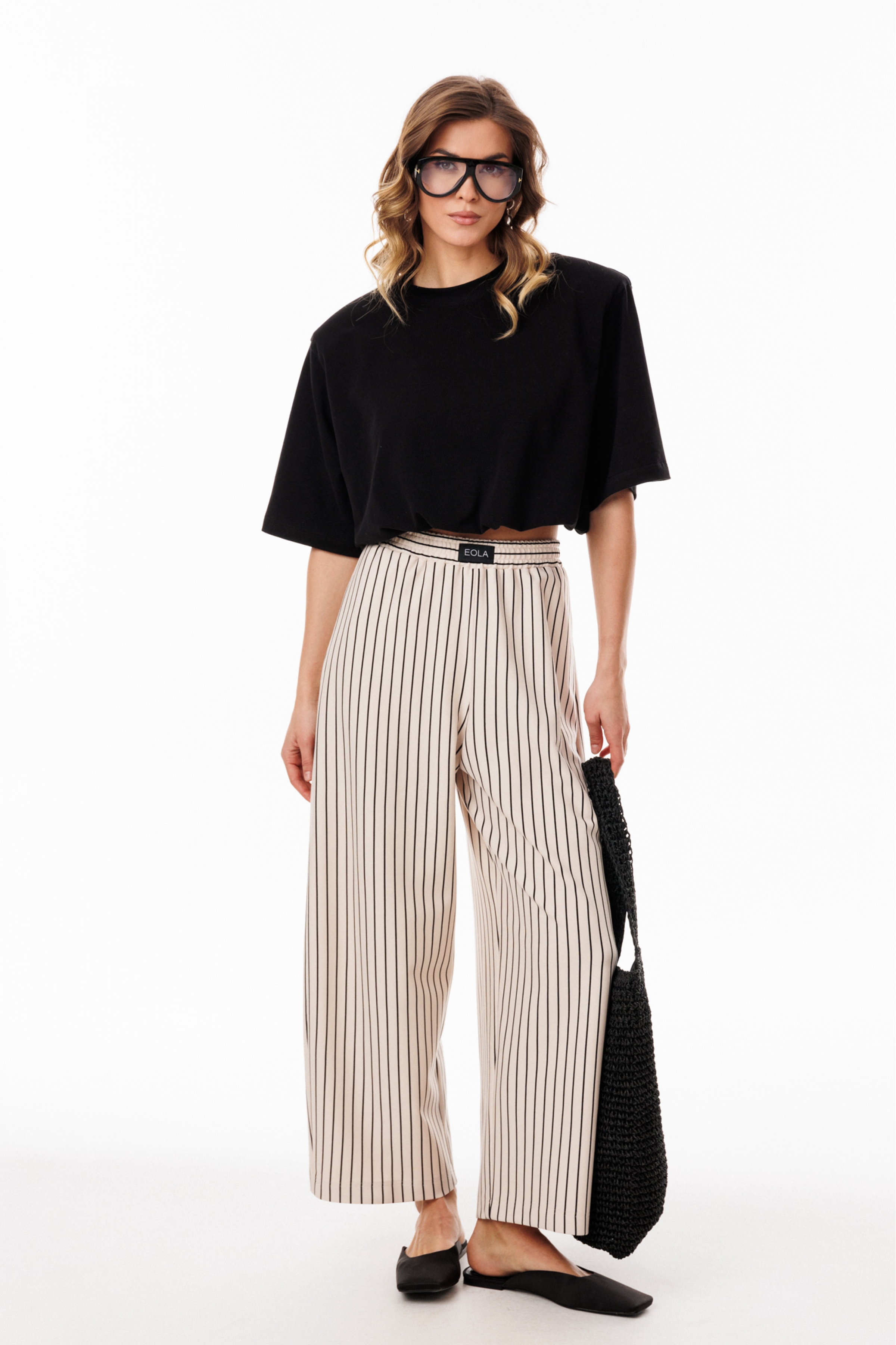 Джемпер выполнен из гладкорашенного трикотажного полотна. Джемпер О-образного силуэта, длиной до линии талии. Перед и спинка цельные. Горловина округлой формы, обработана бейкой. Плечевой шов удлинен. Рукав рубашечного покроя, одношовный, длиной до линии локтя. Джемпер на подкладке из основной ткани в виде нижнего топа на бретелях. Джемпер присборен по низу на эластичную тесьму по линии притачивания к нижнему топу. Джемпер с плечевыми накладками.